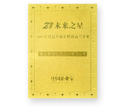“未来之星”是中国年度最具成长力新兴企业的杰出代表,《中国企业家》杂志自2001年开始推出“未来之星——最具成长性的新兴企业”评选,五年来共有105家企业获此殊荣。每届评选出的21家“未来之星——最具成长性的中小企业”,它是从近2000家推荐的中小企业中,由知名企业、高等院校和政府等各领域的专家、教授根据企业的行业地位、成长性、创新性等指标评选出在各行业中最具活力的新兴企业,由于其评选的严肃性、科学性,因此在业界极具影响力。