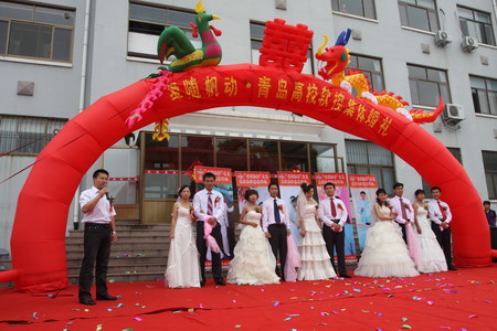 鞭炮齐鸣锣鼓闹,金狮起舞祥云绕。9月20日,青岛fb体育“爱随帆动”集体婚礼隆重举行。在这个收获的季节里,五名年轻员工也收获了各自的爱情,与爱侣喜结连理。公司领导及全体员工共同为他们的爱情作了见证。