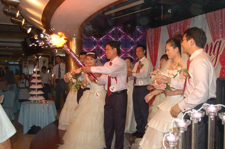下午17时08分,婚宴典礼仪式在银海大世界正式开始。公司副总裁张泽恩为新人证婚,并代表公司向新人及其亲属表示真诚的祝愿。婚宴现场亲情融融,热闹非凡。音乐声中,副总裁王金健手持火炬,将幸福的火种依次传递给五对新人,最后,承载着幸福梦想的心形烛火被点燃,一时间全场沸腾,热闹的气氛达到高潮。宴会上,来宾们还欣赏到了精彩纷呈的文艺表演。