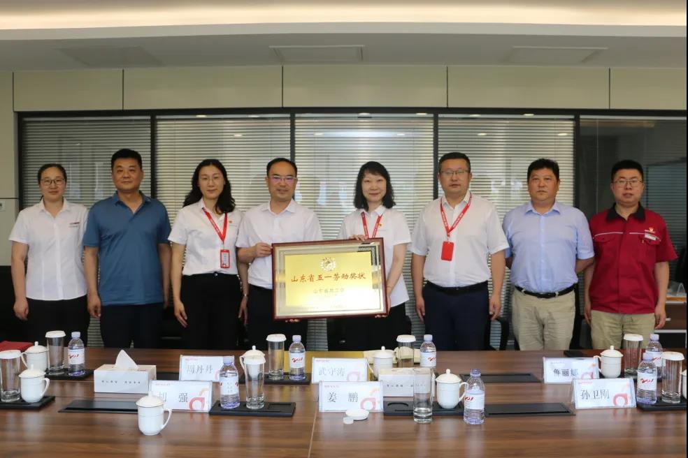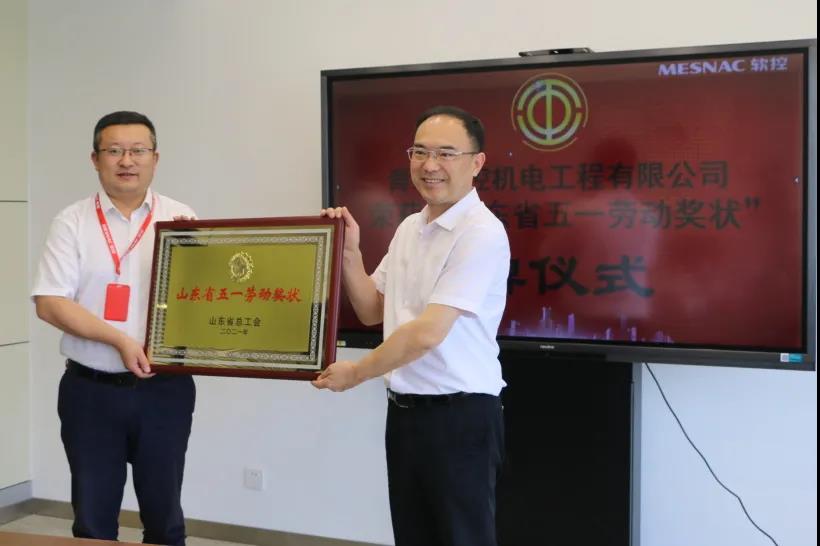 7月9日,胶州市总工会主席姜鹏、副主席孙卫刚、生产部部长胡强一行到胶州装备产业园为青岛fb体育机电工程有限公司荣获2021年“山东省五一劳动奖状”进行授牌。fb体育党委书记、副总裁鲁丽娜代表公司对领导们的到来表示了热烈的欢迎和衷心的感谢;fb体育机电公司总经理武守涛代表公司接受授牌。