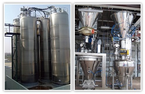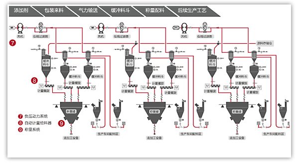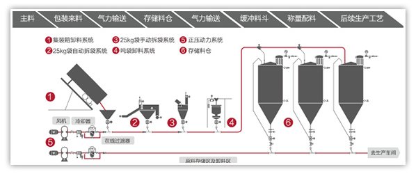 用于塑料改性的多个生产过程(包括主料、添加剂)的自动输送与配料系统。整个过程清洁环保,粉体处于密闭输送状态,与外界隔绝,具体流程可按客户具体生产要求制定。